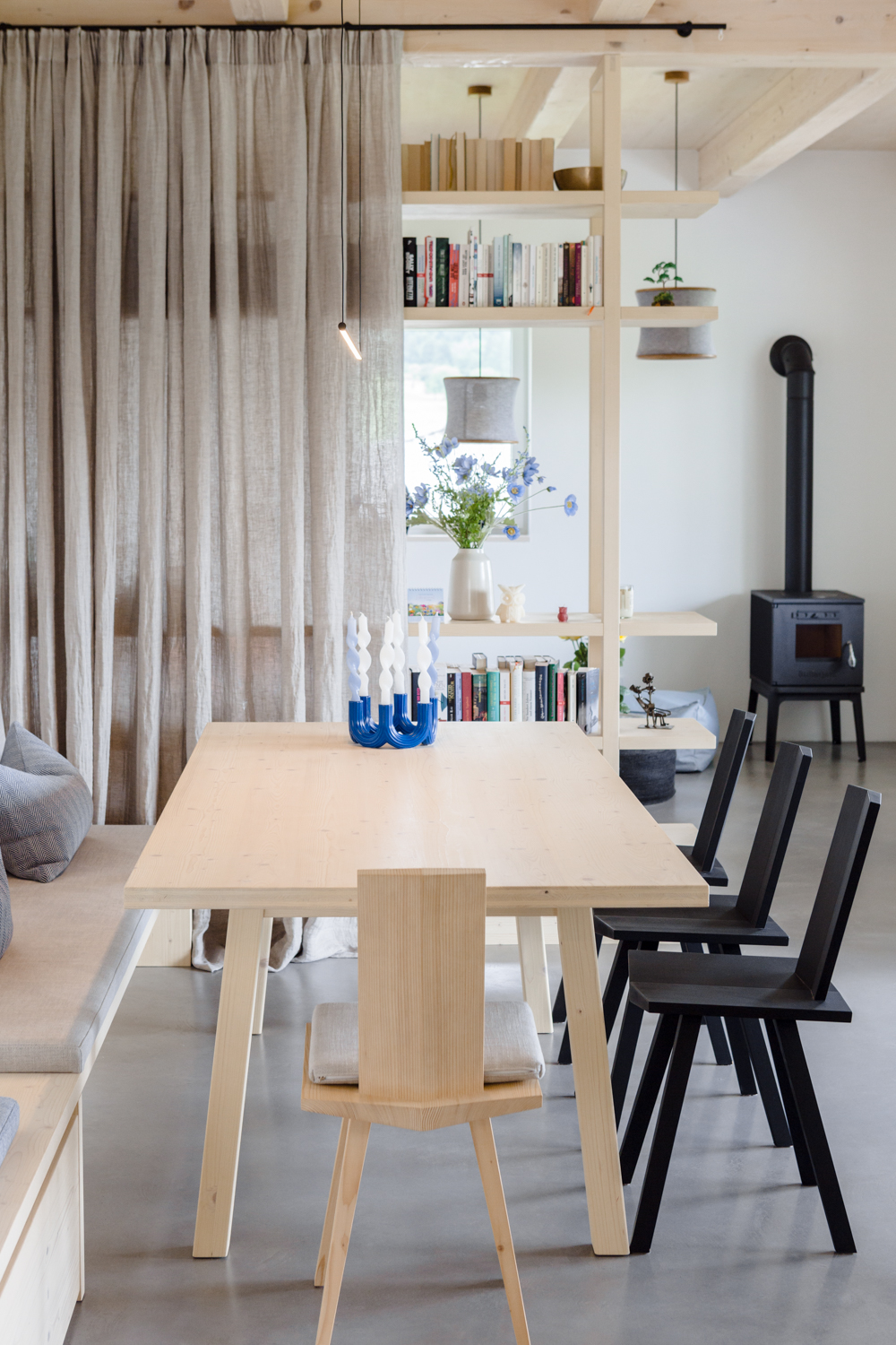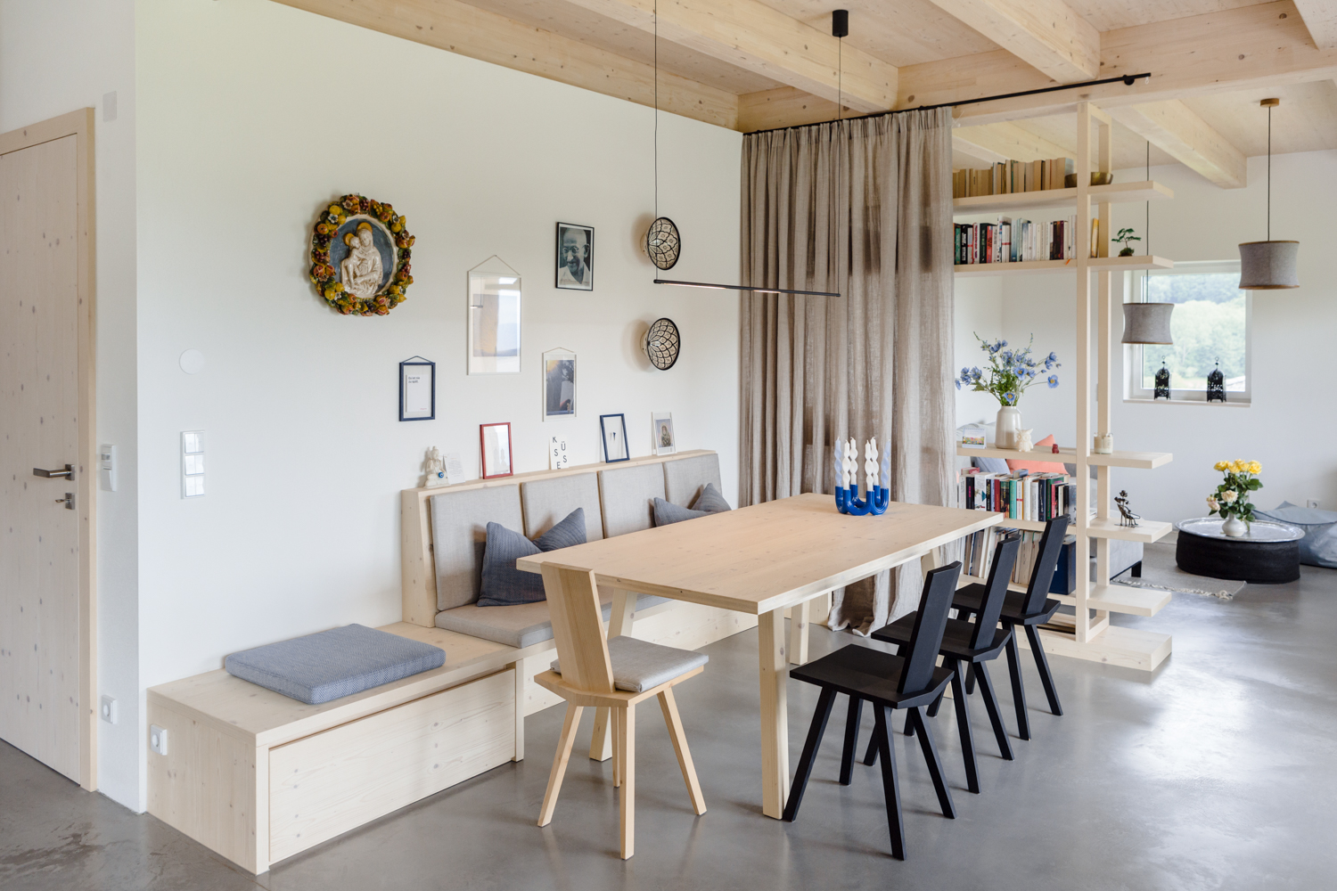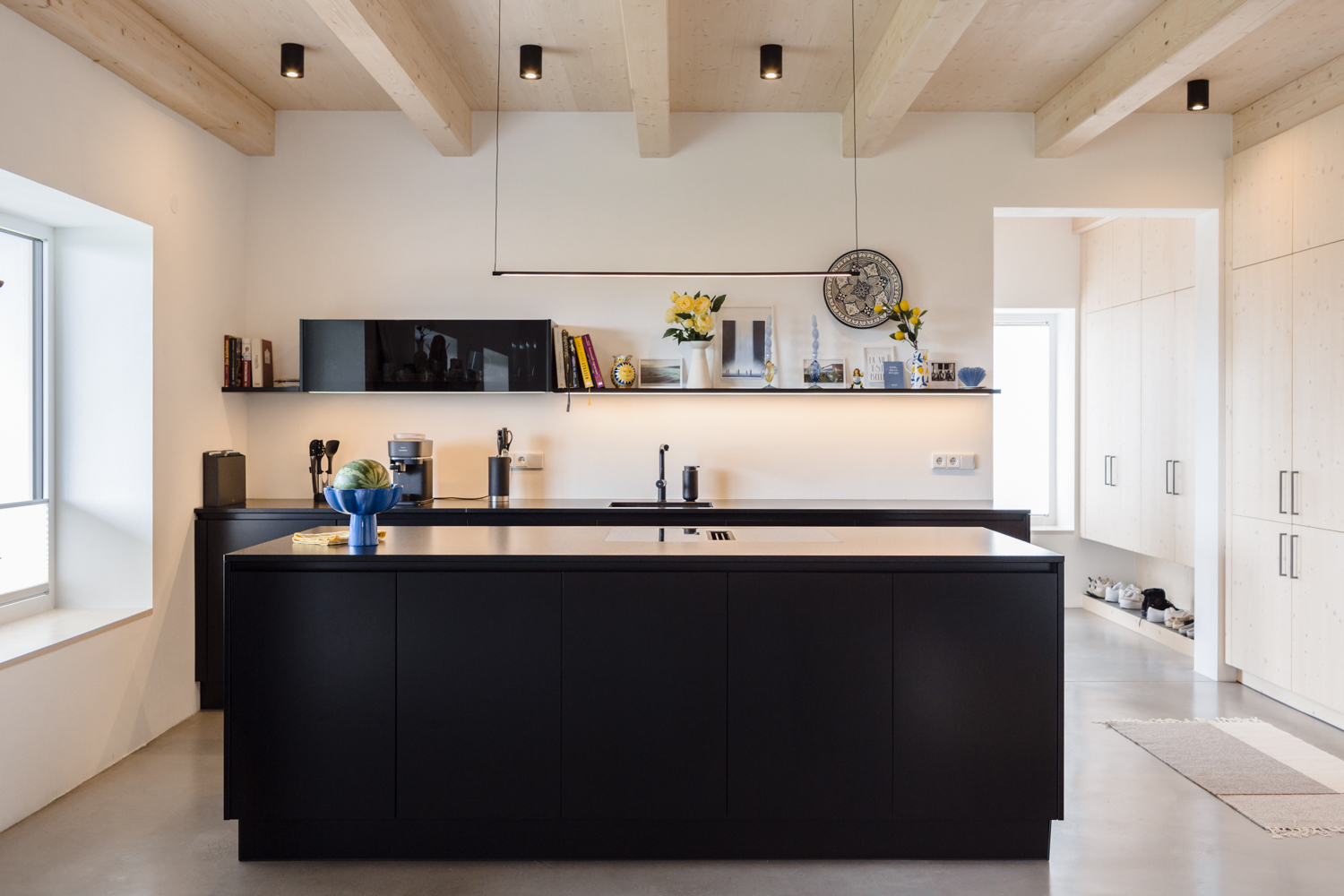 Perfekt zum verweilen ist dieser Essplatz – Frühstück mit Freunden oder zum Abendessen – der zum Highlight des offenen Wohnraums wird. Die helle Gestaltung wird geschickt unterbrochen durch schwarze Akzente. Die Kücheninsel steht als mutiger Kontrast und optischer Blickfang im Mittelpunkt.