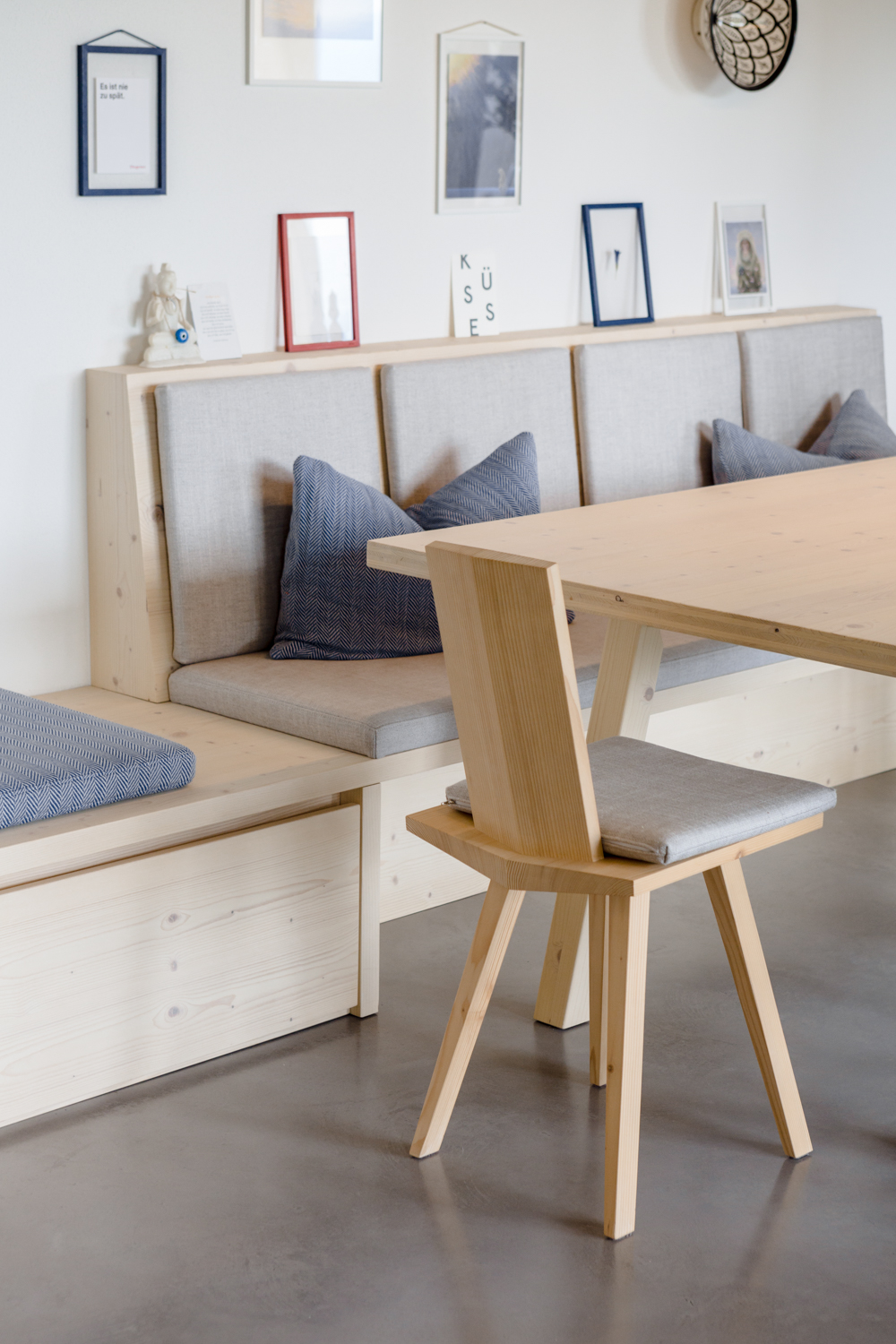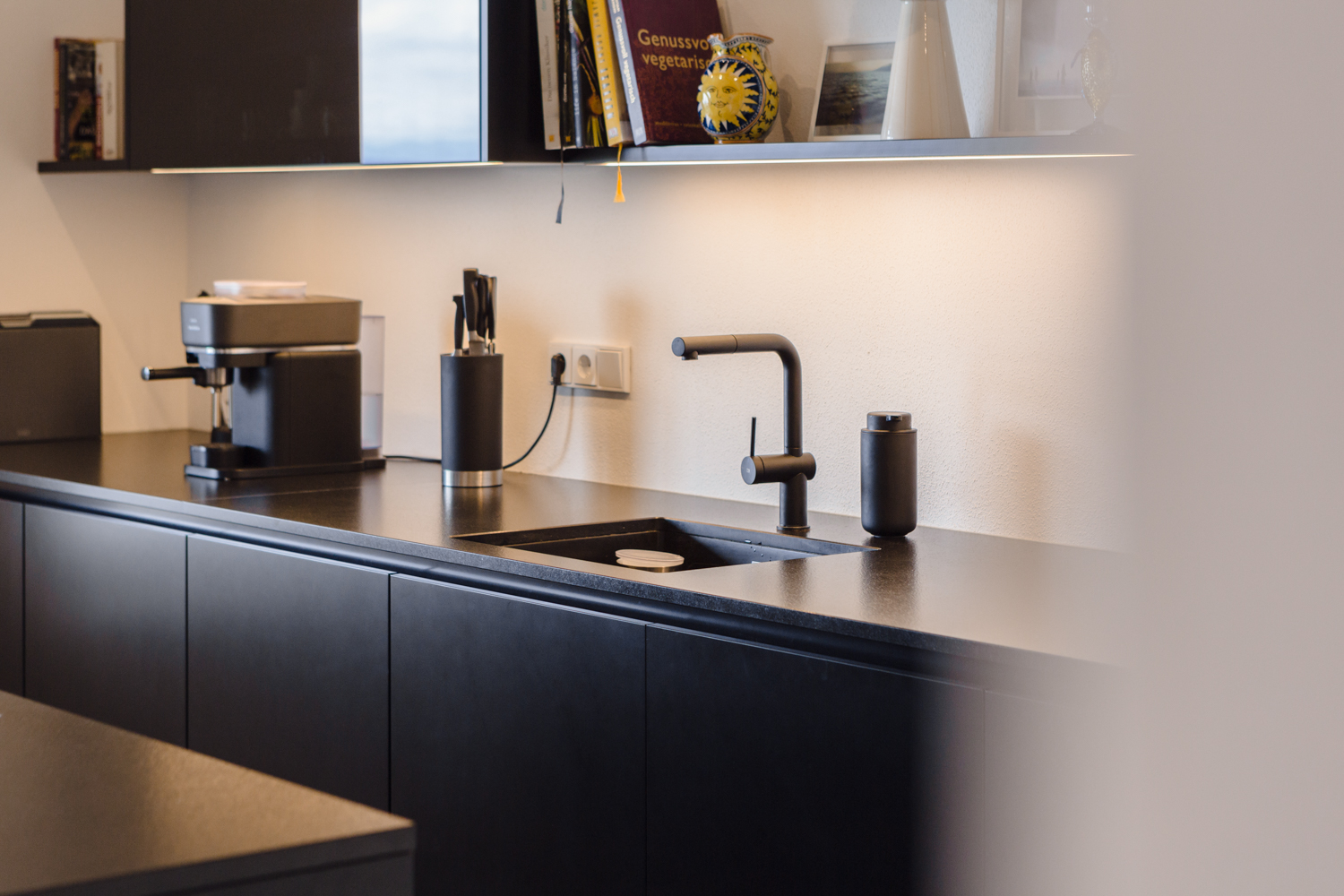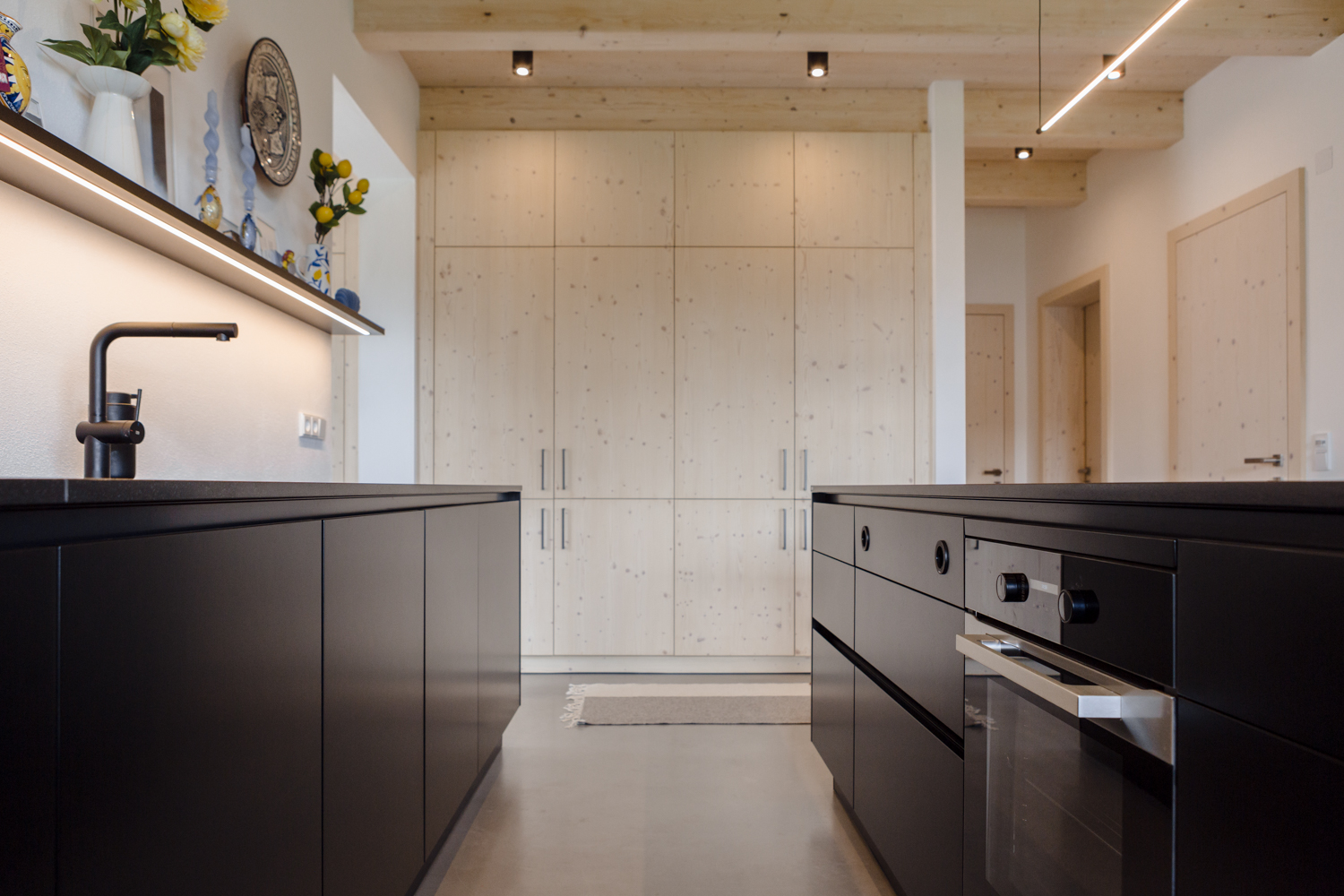 Perfekt zum verweilen ist dieser Essplatz – Frühstück mit Freunden oder zum Abendessen – der zum Highlight des offenen Wohnraums wird. Die helle Gestaltung wird geschickt unterbrochen durch schwarze Akzente. Die Kücheninsel steht als mutiger Kontrast und optischer Blickfang im Mittelpunkt.