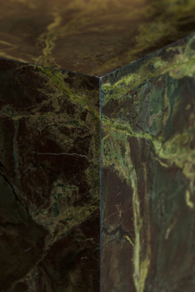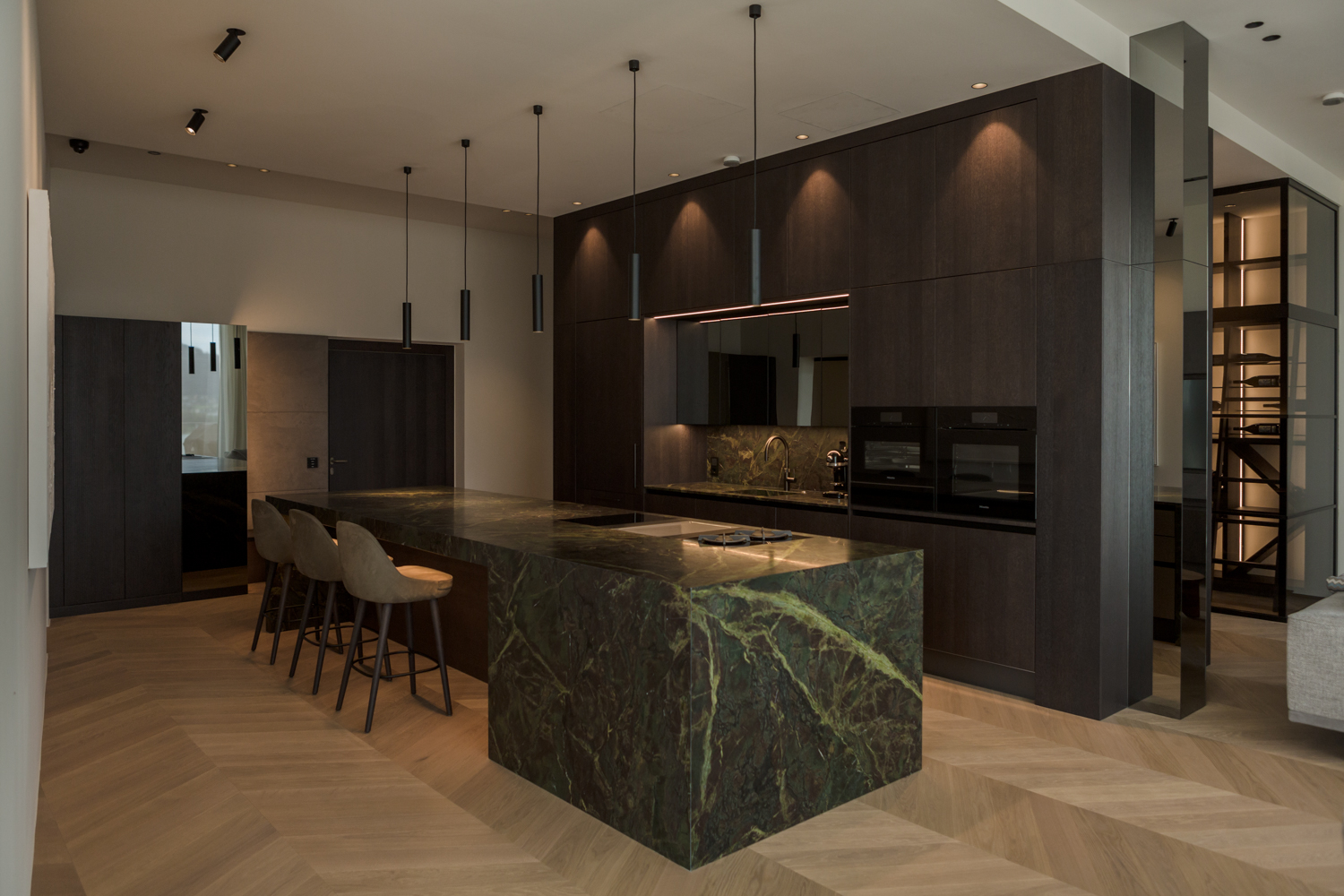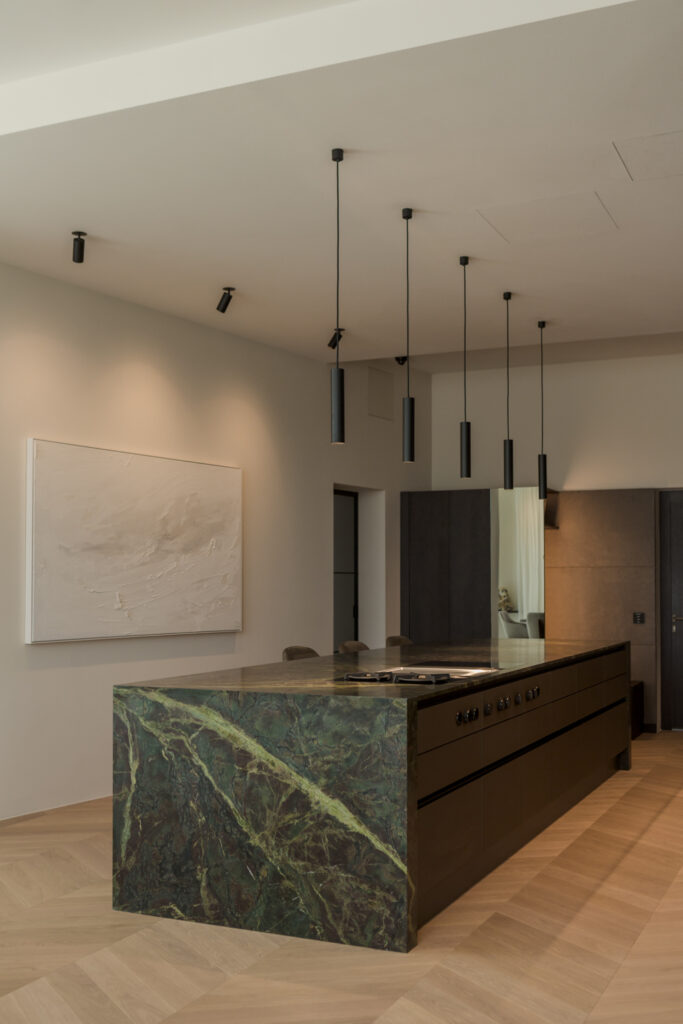 Traumküche in edlen, dunklen Materialien – Dunkelbraune Holzkorpusse und eine moosgrüne, massive Steininsel in einem beeindruckend hohen und offenem Raumkonzept.